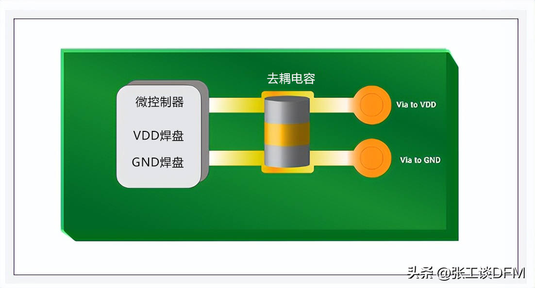 當(dāng) IC 工作時(shí),由于其內(nèi)部結(jié)構(gòu),它們會(huì)以高頻進(jìn)行切換。這種情況會(huì)在 IC 連接軌道中產(chǎn)生開(kāi)關(guān)噪聲。如果不控制這種噪聲,它將導(dǎo)致發(fā)射,從而導(dǎo)致 EMI 。通過(guò)在 IC 附近放置一個(gè)去耦電容,可以減少 PCB 上開(kāi)關(guān)噪聲的傳播并將噪聲引導(dǎo)至地面。