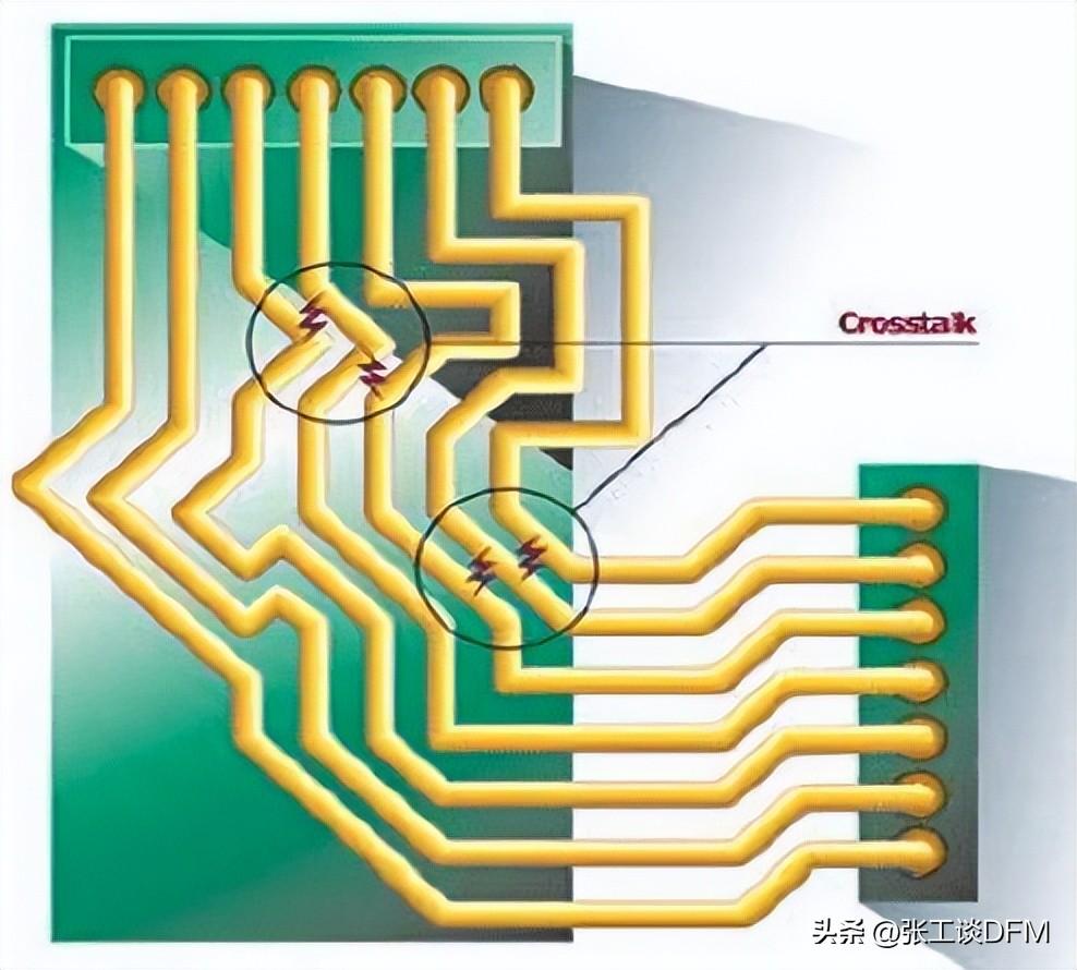 串?dāng)_干擾是指一根信號(hào)線對(duì)相鄰信號(hào)線的干擾,通常發(fā)生在相鄰的電路和導(dǎo)體上,其特點(diǎn)是電路與導(dǎo)體之間存在互電容和互阻抗。例如:PCB上的帶狀線,信號(hào)電平較低,當(dāng)平行線長(zhǎng)度超過(guò)10cm時(shí),串?dāng)_就會(huì)出現(xiàn)。