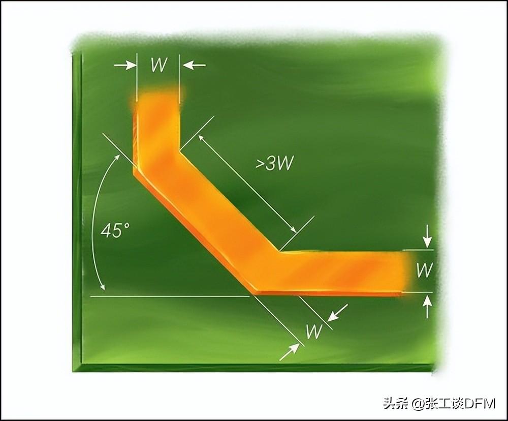 與過(guò)孔類似,不應(yīng)實(shí)施直角 90° 軌道轉(zhuǎn)彎,因?yàn)樗鼤?huì)增加寄生電容,導(dǎo)致特性阻抗發(fā)生變化,從而導(dǎo)致反射。如圖 所示,所有正交走線都應(yīng)采用 45° 彎曲,以限制耦合到附近走線的噪聲。