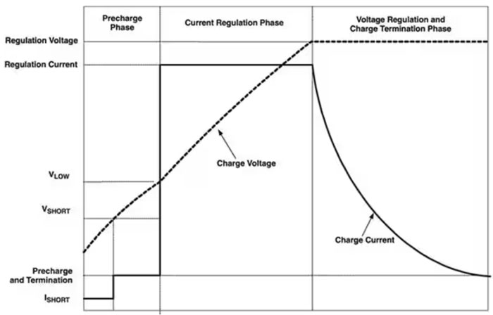 圖 3:鋰離子電池的充電分為三個(gè)不同的階段。首先,電池以適度的恒流預(yù)充,然后以較高的恒流快充,以快速增加能量。最后,當(dāng)電池輸出電壓達(dá)到充電電壓時(shí),充電曲線會(huì)轉(zhuǎn)換到恒壓充電,緩慢充滿電池電量。(圖片來源:Texas Instruments)