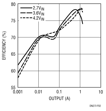 圖2.鋰離子電池對 3.3V、1.3A LTC1872 DC/DC 轉(zhuǎn)換器的典型效率。