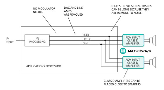 這些放大器不需要模擬輸入 D 類設(shè)計(jì)所需的 DAc 和線路驅(qū)動(dòng)器。因此, 空間和 系統(tǒng)成本下降, 設(shè)計(jì)變得更簡(jiǎn)單。許多 D 類放大器接受脈沖編碼調(diào)制 PCM(  或 I 1  s  數(shù)據(jù), 這需要三根線: BCLK 、LRCLK 和 DIN  (圖 1) 。PCM  數(shù)據(jù)格式不需要 對(duì)調(diào)制器或應(yīng)用處理器上的數(shù)據(jù)上采樣來(lái)提供立體聲數(shù)據(jù)。
