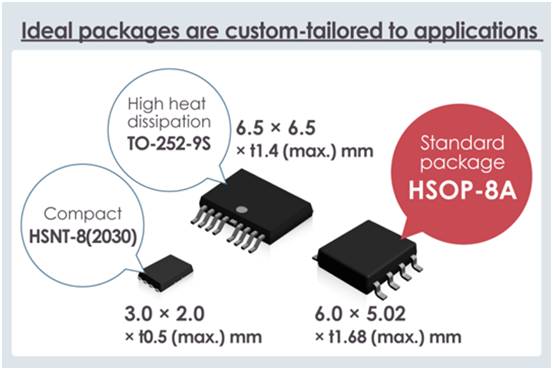 即備有標(biāo)準(zhǔn)封裝的HSOP-8A,還備有可高散熱封裝 的TO-252-9S和小型封裝的のHSNT-8(2030)。