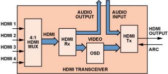 以 ADV7623 為例,這款 HDMI 收發(fā)器集成了 4:1 HDMI 輸入多路復(fù)用器 (mux )、 HDMI 接收器、 屏幕顯示 (OSD)引擎和 HDMI 發(fā)射器。就個(gè)體而言, 上述每種功能應(yīng)該都需要彼此 獨(dú)立的 IC 及五花八門的固件,但一個(gè)收發(fā)器就可以將全部功能組合到一個(gè)綜合解決方案中, 節(jié)省了板載面積、降低了固件 復(fù)雜程度、縮減了物料成本, 為家庭影院系統(tǒng)設(shè)計(jì)人員帶來了 極大方便。