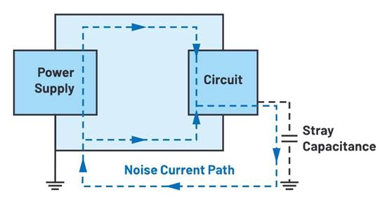 CM噪聲電流是在開關(guān)過程中產(chǎn)生的,通過雜散電容泄漏到參考地,然后通過同一方向的輸入電源和回路返回。通過使用CM扼流圈提高回路中的共模阻抗,可以抑制多余的CM噪聲。