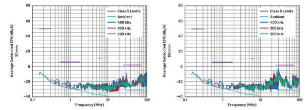 降低開關(guān)頻率可以降低給定高頻下的發(fā)射能量。在圖6中,對(duì)不使用CM扼流圈的電路執(zhí)行電流探頭CE測(cè)試,并比較在200 kHz、300 kHz和400 kHz開關(guān)頻率下的測(cè)試結(jié)果。除RT外的所有組件都保持不變。測(cè)試結(jié)果顯示,200 kHz時(shí)FM頻段內(nèi)的EMI最低,與400 kHz時(shí)相比,輻射降低3.2 dB。