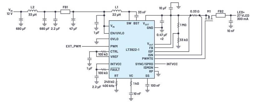 圖2.LT3922-1汽車HUD LED驅動器的簡化原理圖。