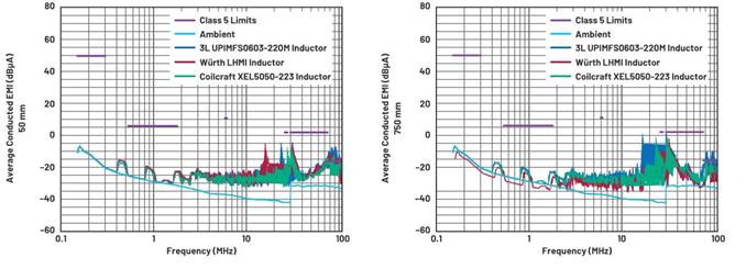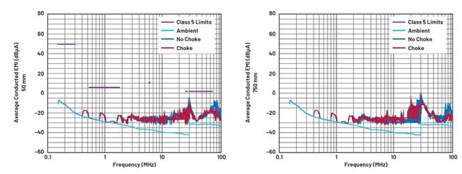 圖4顯示了50 mm和750 mm平均電流探頭CE結果,對不安裝扼流圈的初始電路和將扼流圈安裝在LED驅動器電路之前的電路進行比較。圖中也顯示了環(huán)境本底噪聲作為參考。FM頻段CE(76 MHz至~108 MHz)降低了8 dBµA以上。