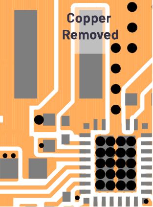 高dV⁄dt開關節(jié)點是一個噪聲源,會產生電容耦合,增加CE中的CM EMI噪聲。它也像天線一樣工作,向空間輻射電磁噪聲,也會影響輻射EMI。因此,盡可能減小PCB布局上的開關節(jié)點面積可以改善EMI性能。為了在PCB電路板上測試這一點,我們切除了部分銅芯,并將電感移動到更靠近IC的位置(如圖7所示),以此減小開關節(jié)點面積。我們測試了切除銅芯之前和之后的EMI,測試結果如圖8所示。