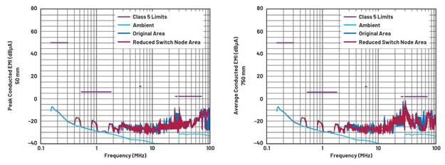 結果顯示,50 mm電流探頭CE測試在105 MHz時降低了1 dB,而750 mm測試沒有明顯改善。這一結果表明,在此應用中,銅芯面積不是影響FM頻段EMI的主要因素。盡管如此,為了實現低EMI的PCB布局,或在設法消除EMI期間,盡量減小開關節(jié)點面積仍然是值得嘗試的。