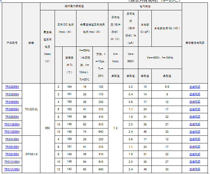 - 低反向電流:TRS6E65H IR=1.1μA(典型值)(VR=650V)