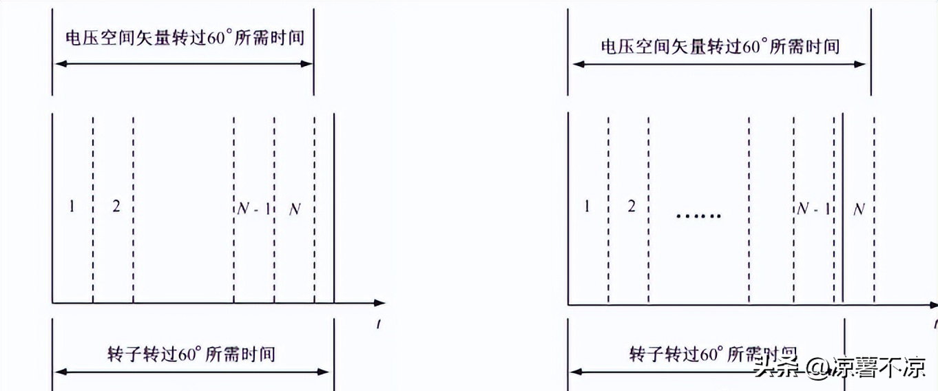 除以N等分,就可得到每個60/N電角所持續(xù)的時間,但是當(dāng)前60度區(qū)間持續(xù)的時間不可能事先得到,實(shí)際實(shí)現(xiàn)時只能用上一個60度區(qū)間所持續(xù)的時間來近似代替當(dāng)前60度區(qū)間的持續(xù)時間。