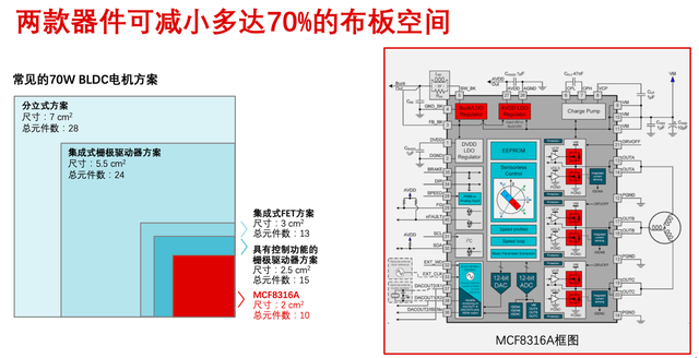 為什么TI的芯片能夠如此大幅度減小尺寸?這是因?yàn)槠毡閬?lái)說(shuō),70W BLDC電機(jī)驅(qū)動(dòng)全分立方案包含MCU、MOSFET功率器件、門極驅(qū)動(dòng)三部分,這種情況下總元器件數(shù)需要28個(gè),尺寸將近7平方厘米。如果將方案進(jìn)一步集成,便可獲得更少的器件和更小的面積。