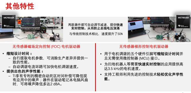 兩款產(chǎn)品也各具特色,MCF8316A作為一款無(wú)傳感器磁場(chǎng)定向控制(FOC)電機(jī)驅(qū)動(dòng)器,在電機(jī)啟動(dòng)時(shí)能夠自動(dòng)識(shí)別電機(jī)參數(shù),解決參數(shù)不一致的擔(dān)憂,同時(shí)自動(dòng)配置PI參數(shù),無(wú)需工程師逐一修正;另外,該芯片可以通過(guò)自動(dòng)死區(qū)時(shí)間不長(zhǎng),將噪聲降低多達(dá)2dbA。