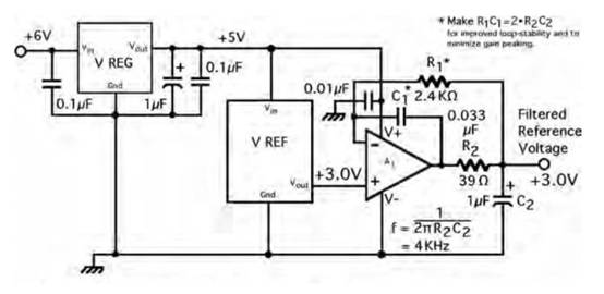 如您所見(jiàn),由R 2和C 2創(chuàng)建的單極點(diǎn)低通濾波器位于精密放大器的輸出端。這樣,我們就可以避免電壓基準(zhǔn)IC驅(qū)動(dòng)大的容性負(fù)載。雖然低通濾波器將抑制來(lái)自基準(zhǔn)和運(yùn)算放大器的噪聲,但我們?nèi)匀恍枰\(yùn)算放大器具有非常低的噪聲、低偏移和低漂移。電阻應(yīng)采用低TC精密型,電容應(yīng)采用優(yōu)質(zhì)聚丙烯電容。