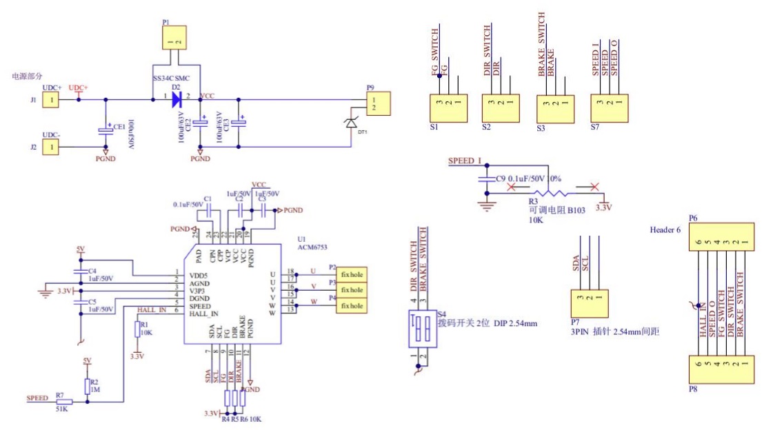 2)控制方式2, 硬件pin控制。SPEED pin支持外部的電壓,PWM占空比,PWM頻率等調(diào)速方式;DIR pin控制電機(jī)的正反轉(zhuǎn);BRAKE pin支持剎車(chē)。在硬件控制模式下,ACM6753內(nèi)部的控制參數(shù)通過(guò)I2C編 程燒寫(xiě)?梢韵壤肬SB轉(zhuǎn)I2C的調(diào)試小工具通過(guò)控制方式1(I2C)把參數(shù)調(diào)試好,然后一次性燒錄進(jìn)去。 燒錄好的ACM6753下次上電可以直接由外部管腳控制。