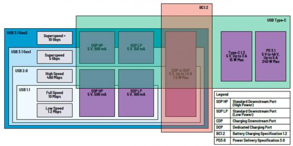 圖1匯總列出每個USB標準允許的功率容量、最大電流和電壓。