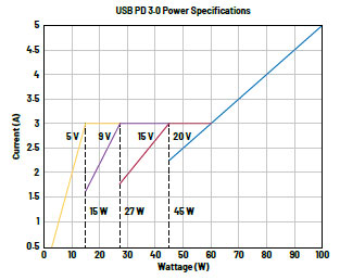 USB PD 3.0標準要求電源根據(jù)其功率容量,提供特定的供電軌。能夠提供超過15 W的電源必須提供5 V和9 V供電軌。能夠提供超過27 W的電源必須提供5 V、9 V和15 V供電軌。最后,能夠提供超過45 W的電源必須提供5 V、9 V、15 V和20 V供電軌。