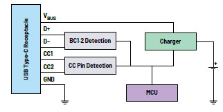 CC引腳檢測IC通過測量CC引腳的電壓來確認電纜的方向和拉電流能力。該IC還需要電源的灌電壓和灌電流能力,并在在線設備選擇電壓和電流時將信息返回給電源。