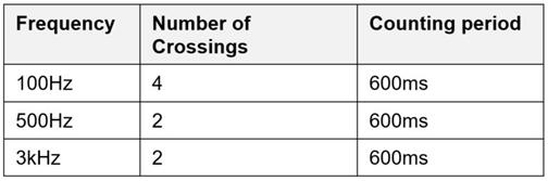音頻信號(hào)檢測(cè)的基本原理如圖 1所示。系統(tǒng)設(shè)計(jì)考慮三個(gè)參考頻率:100 Hz、500 Hz 和 3 kHz。對(duì)于給定的信號(hào),系統(tǒng)計(jì)算在一定時(shí)間內(nèi)該信號(hào)的頻率與參考頻率交叉的次數(shù)。僅考慮從低頻到高頻的交叉;例如,50 Hz 至 150 Hz 將計(jì)入 100 Hz,而 150 Hz 至 50 Hz 則不計(jì)入 100 Hz。如果信號(hào)與兩個(gè)參考頻率中的任意一個(gè)交叉的次數(shù)達(dá)到表 1中指定的少次數(shù),則設(shè)計(jì)會(huì)將信號(hào)視為音頻。