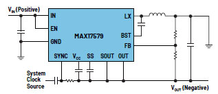 圖3.MAX17579設計為反相降壓-升壓穩(wěn)壓器,其中已集成電平轉(zhuǎn)換功能