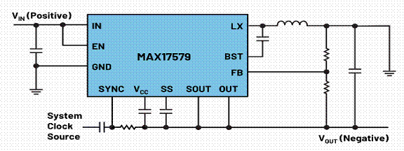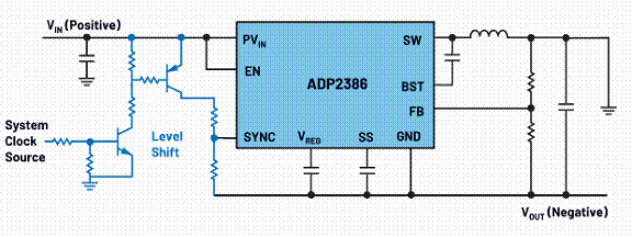 反相降壓-升壓電路產生的負電壓幅度可以高于或低于可用正電壓的幅度。例如,從+12 V可以生成-8 V,甚至-14 V。當使用具有反相降壓-升壓電路的開關穩(wěn)壓器IC時,系統(tǒng)可能需要設計通信引腳。如果確實需要,設計人員必須進行充分的電平轉換,以便可以利用同步和使能信號。