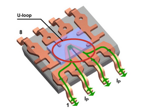 圖 1 ACS 封裝的內(nèi)部結(jié)構(gòu),顯示 U 形初級(jí)銅導(dǎo)體和單個(gè)倒裝芯片安裝的霍爾 IC。