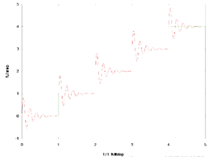 電機(jī)定子線(xiàn)圈的電流并不是最大電流(Fullcurrent) 或者就是沒(méi)有電流,而是一個(gè)中間的電流 值,相比于4個(gè)整步電流(4 full steps) 更接近于一個(gè)正弦波形狀。永磁體的轉(zhuǎn)子位置處在2個(gè)整步位置之間(合成磁場(chǎng)位置) 。最大的細(xì)分?jǐn)?shù)是由驅(qū)動(dòng)器的A/D和D/A能力決定。TRINAMIC所提供的驅(qū)動(dòng) 和控制器可以達(dá)到256細(xì)分(8bit) 采用集成的正弦波配置表格,步進(jìn)電機(jī)可以實(shí)現(xiàn)非常小的角度控 制,圖4描述了在達(dá)到新位置時(shí)候的波動(dòng)。