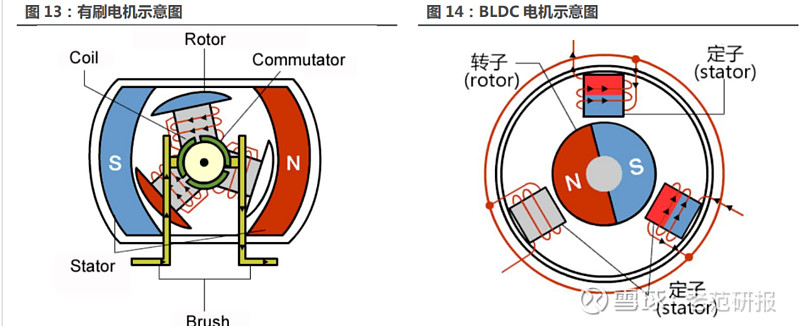 在BLDC電機直流無刷電機線圈在定子上轉(zhuǎn)子是永磁體通過改變周圍的線圈所產(chǎn)生的磁場的方向使轉(zhuǎn)子旋轉(zhuǎn)通過控制通向線圈的電流方向和大小來控制轉(zhuǎn)子的旋轉(zhuǎn)由于無需向轉(zhuǎn)子通電所以無需電刷與有刷電機相比BLDC電機效率高控制性好運轉(zhuǎn)過程中噪音小且不產(chǎn)生火花成本相對也更高