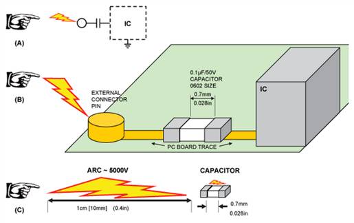 難怪當(dāng)我們走過(guò)地毯并觸摸門(mén)把手時(shí)會(huì)感到疼痛!一般規(guī)則是,5,000 V 在 50% RH 空氣中可以跳動(dòng)約 1 厘米(0.4 英寸)。對(duì)于五六英尺高的人來(lái)說(shuō),這是一個(gè)火花;對(duì)于一個(gè)五六英尺高的人來(lái)說(shuō),這就是一個(gè)火花。這很痛苦,但我們活了下來(lái),F(xiàn)在改變你的觀點(diǎn)。火花會(huì)對(duì)幾微英寸高的物體(例如集成電路(IC)中的晶體管)造成什么嚴(yán)重破壞?在這種情況下,一厘米的火花就是巨大的、令人恐懼的閃電。