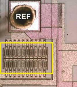 顯微照片圖 2A 顯示沒(méi)有明顯損壞。提供了標(biāo)有 REF 的鍵合線和焊盤(pán),以便我們可以定位并比較照片。液晶材料涂在模具上(粉紅色),與心情環(huán)和兒童額頭溫度計(jì)中使用的液晶類(lèi)似。它會(huì)隨著溫度的微小變化而改變顏色。當(dāng) IC 通電時(shí),消耗過(guò)多電流的區(qū)域(此處用黃色框標(biāo)記)會(huì)發(fā)熱并改變顏色。這是一個(gè)熱點(diǎn)。這很有趣,但是是什么導(dǎo)致了這個(gè)問(wèn)題呢?