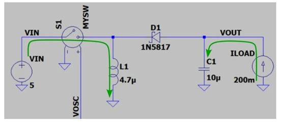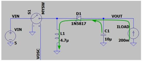 圖 3 顯示了開關(guān)導(dǎo)通狀態(tài)下電流通過電路的路徑: 當(dāng)開關(guān)導(dǎo)通時,電流從輸入電源流經(jīng)電感器,然后流至地。