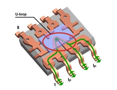 ACS71x 設(shè)備中的當(dāng)前路徑。電流沿任一方向通過 U 形環(huán)路并繞過霍爾元件 (X)。U 形環(huán)安裝在 SOIC8 封裝中的芯片下方。