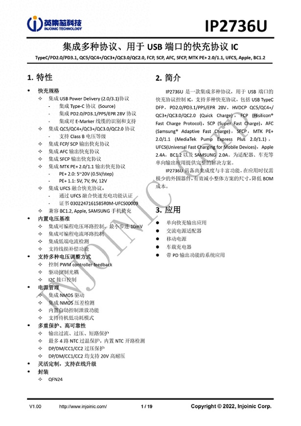 首先介紹的是IP2736,協(xié)議芯片在充電器中起到非常重要的作用,協(xié)議芯片一方面連接到充電器初級(jí)反饋或者次級(jí)降壓反饋,并通過連接的用電設(shè)備,調(diào)節(jié)充電器的輸出電壓為用電設(shè)備所需要的電壓,從而提供豐富的設(shè)備支持。