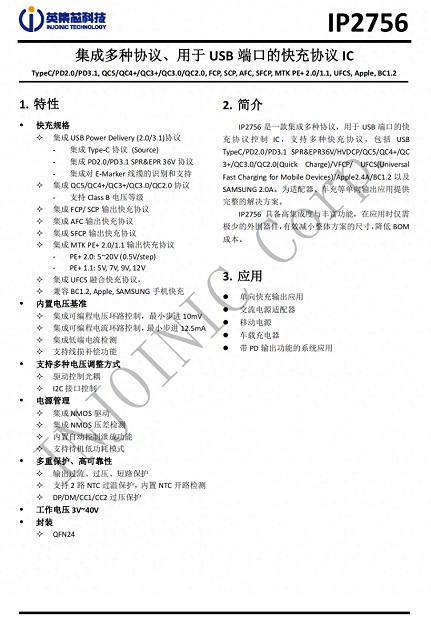 英集芯 IP2756 是一款集成多種協(xié)議,用于 USB 端口的快充協(xié)議控制 IC,支持多種快充協(xié)議,包括 PD2.0/PD3.1 SPR&EPR36V、HVDCP、QC5/4+/3+/3.0/2.0、VFCP、UFCS、Apple 2.4A、BC1.2 以及 SAMSUNG 2.0A。為適配器、車充等單向輸出應(yīng)用提供完整的解決方案。