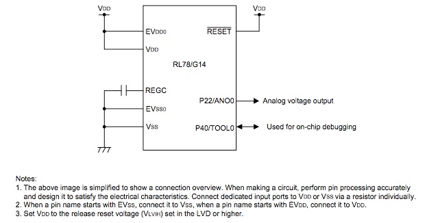 使用 DAC0 從 ANO0 引腳輸出模擬電壓。DAC0 轉(zhuǎn)換操作啟用后,模擬輸出電壓立即為 0.0 V。在間隔定時(shí)器模式下使用 TAU0 通道 0 (TAU00),并每 200 ?s 生成中斷。通過 TAU00 計(jì)數(shù)結(jié)束中斷啟動(dòng)使用 ELC 的 DAC0 的模擬輸出電壓轉(zhuǎn)換。同時(shí)啟動(dòng) DTC,并將 D/A 轉(zhuǎn)換值表中存儲(chǔ)的值傳送到 D/A 轉(zhuǎn)換值設(shè)置寄存器 0(DACS0)。