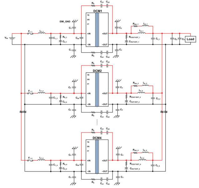 圖 4:DCM2322 DC-DC 穩(wěn)壓轉換器可以陣列方式布置,提供高達 800 W 的功率;原理圖顯示了高效、安靜運行所需的輸入濾波器和去耦網絡。(圖片來源:Vicor)