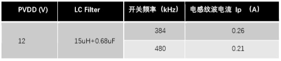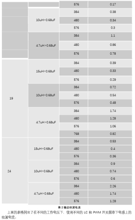 上面的表格列出了在不同的工作電壓下,使用不同的LC和PWM開(kāi)關(guān)頻率下電感上的紋波電流。