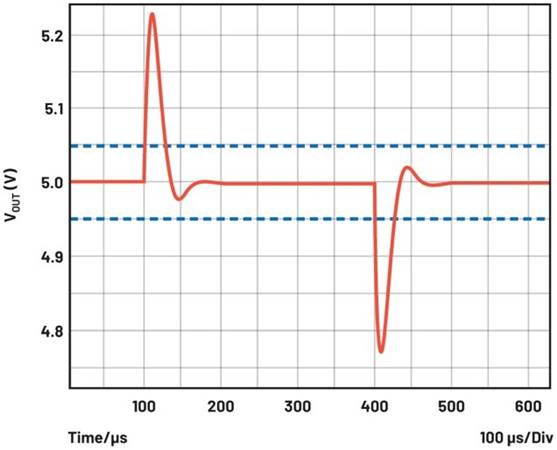 當(dāng)需要嚴(yán)格調(diào)節(jié)的電源電壓時(shí),可以利用開關(guān)穩(wěn)壓器數(shù)據(jù)手冊(cè)中的直流電壓精度規(guī)格。該精度值通常為±1%或±0.5%。如果電壓轉(zhuǎn)換器在反饋路徑中使用外部電阻分壓器,進(jìn)行電壓精度計(jì)算時(shí)必須要包含電阻的容差。此外,除了直流精度外,還必須考慮動(dòng)態(tài)電壓精度。如果發(fā)生負(fù)載瞬變,即負(fù)載突然消耗高電流,則生成的電壓可能會(huì)低于或高于設(shè)定點(diǎn)電壓,然后穩(wěn)定在設(shè)定點(diǎn)水平。此行為取決于控制環(huán)路的速度。對(duì)于必須嚴(yán)格調(diào)節(jié)電源電壓的應(yīng)用,在此類負(fù)載瞬變期間通常也需要提供精密電壓。圖1顯示了發(fā)生負(fù)載瞬變后時(shí)域中的典型電壓響應(yīng)。可以看到,100μs后連接了一個(gè)負(fù)載,400μs后斷開了該負(fù)載。