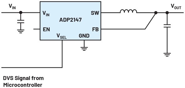 圖2.通過(guò)VSEL引腳實(shí)現(xiàn)簡(jiǎn)單DVS的降壓穩(wěn)壓器