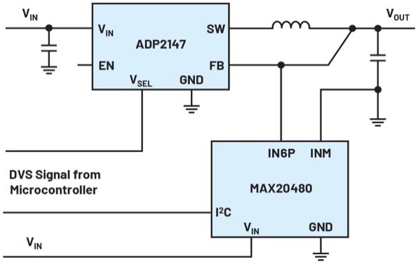 特殊的監(jiān)控IC(例如MAX20480電源系統(tǒng)監(jiān)視器)也可以與DVS系統(tǒng)一起使用,以實(shí)現(xiàn)可靠的電壓監(jiān)控。MAX20480具有數(shù)字I2C接口;就像圖2中的開關(guān)穩(wěn)壓器一樣,它可以通過(guò)VSEL引腳動(dòng)態(tài)切換,在使用DVS系統(tǒng)時(shí)可用于監(jiān)控較高或較低的直流電壓。圖3顯示了圖2中DVS開關(guān)穩(wěn)壓器的框圖,其中增加了支持DVS的電壓監(jiān)控IC。