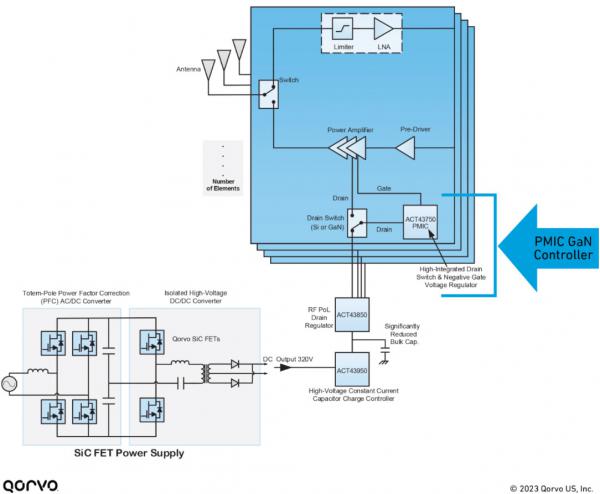 ACT41000可用于低電壓解決方案;其漏極電壓范圍為3至24V。往期博文《使用電源管理模塊為GaN功率放大器上電(和斷電)》對(duì)這一器件進(jìn)行了概述;此篇博文和相關(guān)視頻教程(qorvo.com/design-hub/videos/using-advanced-power-management-to-optimize-gan-pa-performance)介紹了如何在系統(tǒng)中設(shè)置和使用該器件。