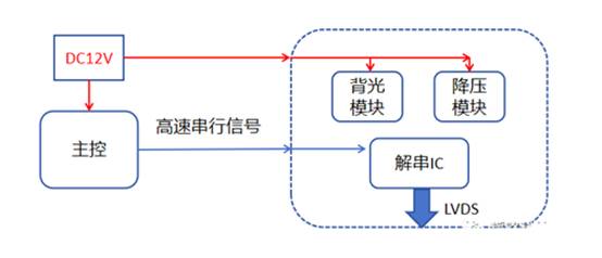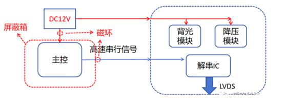 客戶的產(chǎn)品為一個(gè)顯示屏驅(qū)動(dòng)電路,通過(guò)將主控傳輸過(guò)來(lái)的高速串行信號(hào)進(jìn)行解碼,再傳送到顯示屏。主要模塊分為三部分,一個(gè)是背光升壓模塊,用于給背光供電,開(kāi)關(guān)頻率為2.2MHz,一個(gè)是降壓模塊,給解串IC供電,開(kāi)關(guān)頻率為500KHz,另一個(gè)是信號(hào)解串模塊,解串后輸出LVDS時(shí)鐘頻率為48MHz。簡(jiǎn)單電路框架如下:
