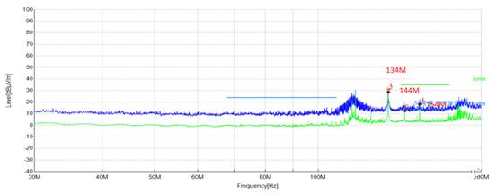 從上面的數(shù)據(jù)中可以看到,出現(xiàn)了10MHz間隔的頻率點(diǎn),并且在154MHz頻點(diǎn)處超標(biāo)。