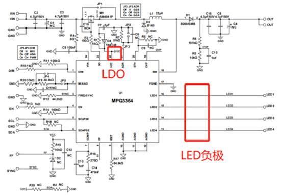 現(xiàn)在我們可以鎖定問(wèn)題點(diǎn)就是背光模塊,雖然不知道芯片內(nèi)部的運(yùn)作模式,但我們可以通過(guò)外圍濾波,抑制噪聲輻射。下面是升壓芯片的推薦電路圖: