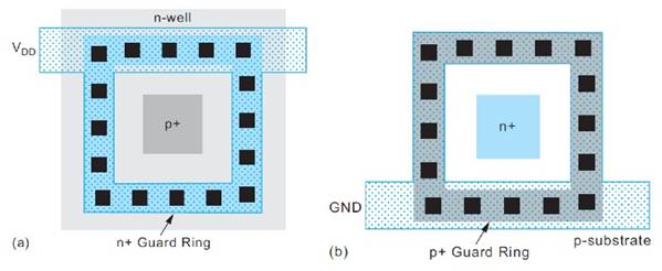 幸運(yùn)的是,可以通過降低襯底和阱之間的電阻來防止閂鎖。實(shí)現(xiàn)這一目標(biāo)的常見方法是將基板和孔抽頭放置在靠近每個(gè)晶體管的位置(Neil 和 David)。