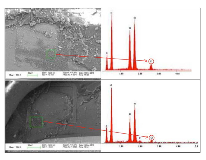 鹵化物是離子性的并且?guī)в须姾;例如,Cl‐、Br‐ 和 F‐。氯是電負(fù)性強的離子,該物質(zhì)通過 Vcc(電源)電勢引起的電場漂移遷移到封裝中。Vcc(電源)焊盤通常是個受到氯相關(guān)問題“攻擊”的焊盤。一般來說,GND(地)焊盤一般不會被腐蝕,因為該焊盤一般處于地電位或電位。Vcc(電源)焊盤通常是個受到氯相關(guān)問題“攻擊”的焊盤。一般來說,GND(地)焊盤一般不會被腐蝕,因為該焊盤一般處于地電位或電位。這表明不需要對鉛模具界面進(jìn)行分層以使離子污染物進(jìn)入。僅僅存在離子物質(zhì),在存在水分和電位差等加速因素的情況下,足以啟動離子污染過程。圖 1 顯示了環(huán)境中的氯離子如何進(jìn)入封裝并腐蝕焊盤的機制。圖 2 顯示在引線框架與模制化合物(未分層)之間的界面處發(fā)現(xiàn)了氯,圖圖3顯示了由于使用鹵化物助焊劑而導(dǎo)致的焊盤腐蝕。
