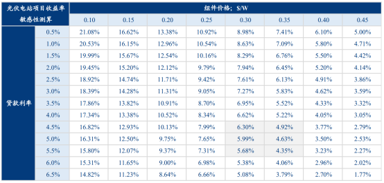 根據(jù)華創(chuàng)證券的光伏電站項目收益率敏感性測算表,假設(shè)貸款比例 70%,貸款利率 5.5%。組件價格在 0.15$/W 時,貸款利率提升1%,對于收益率下降約0.85%-0.95%。