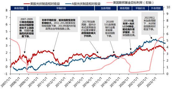 復(fù)盤歷史,2019年,光伏板塊指數(shù)靠著光伏平價帶來行業(yè)市場化拐點和降息帶來的融資成本下降刺激海外需求上升兩大因素持續(xù)走高。然而,歷史總是驚人的相似。如今產(chǎn)能過剩促使光伏組件價格加速下跌,甚至跌破部分成本價,帶動光伏LCOE再次降低;美聯(lián)儲也會在2024年開始新一輪降息周期。兩因素的疊加會大大增加光伏電站的收益率,促使光伏電站加速建設(shè)。