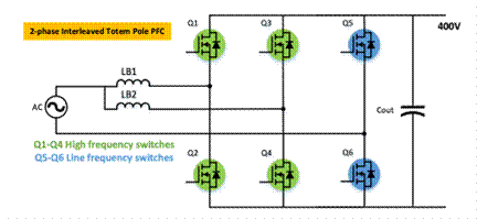 在中高功率的功率因子校正應用(通常為6.6kW及以上)中,無橋圖騰柱拓撲變得越來越普及。如圖2所示,在這種拓撲中,慢橋臂(Q5-Q6)以電網(wǎng)頻率(50-60Hz)開關(guān),而快橋臂(Q1-Q4)則會進行電流整形和升壓,并在硬開關(guān)模式下以更高頻率(通常為65-110kHz)運行。盡管無橋圖騰柱拓撲大幅提高了效率并減少了功率元件的數(shù)量,但它提高了控制方面的復雜性。